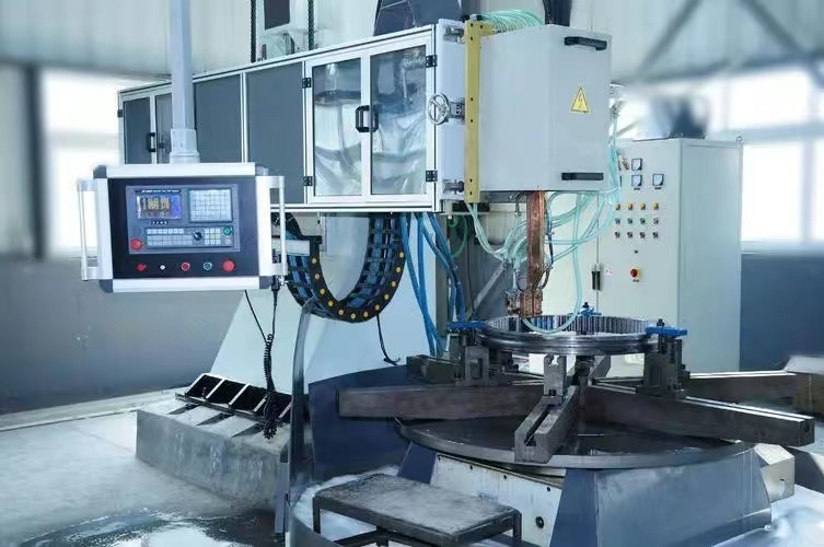 (2)單工位雙淬火變壓器感應(yīng)器組立式回轉(zhuǎn)支承,該回轉(zhuǎn)支承它采用一個(gè)立式升降機(jī)構(gòu),兩套淬火變壓器感應(yīng)器組.一套用以淬凸輪,另一套用以淬軸頸。兩套感應(yīng)器均是雙孔的,如網(wǎng)兩套淬火變壓器感應(yīng)器組是相互呈90。交叉,共對(duì)著回轉(zhuǎn)支承淬火機(jī)床感應(yīng)設(shè)備的雙中心線(xiàn)。為此.一套感應(yīng)器的兩個(gè)孔是左右配置,而另一套感應(yīng)器的二個(gè)孔呈前后分布以上兩種回轉(zhuǎn)支承淬火機(jī)床感應(yīng)設(shè)備適用于不是大批量生產(chǎn)的,因?yàn)樗遣捎冒错樞蚍侄我淮未慊鸱绞剑珜?duì)中頻電源來(lái)說(shuō),由于采用兩個(gè)工位交替加熱,其暫載率是較高的。