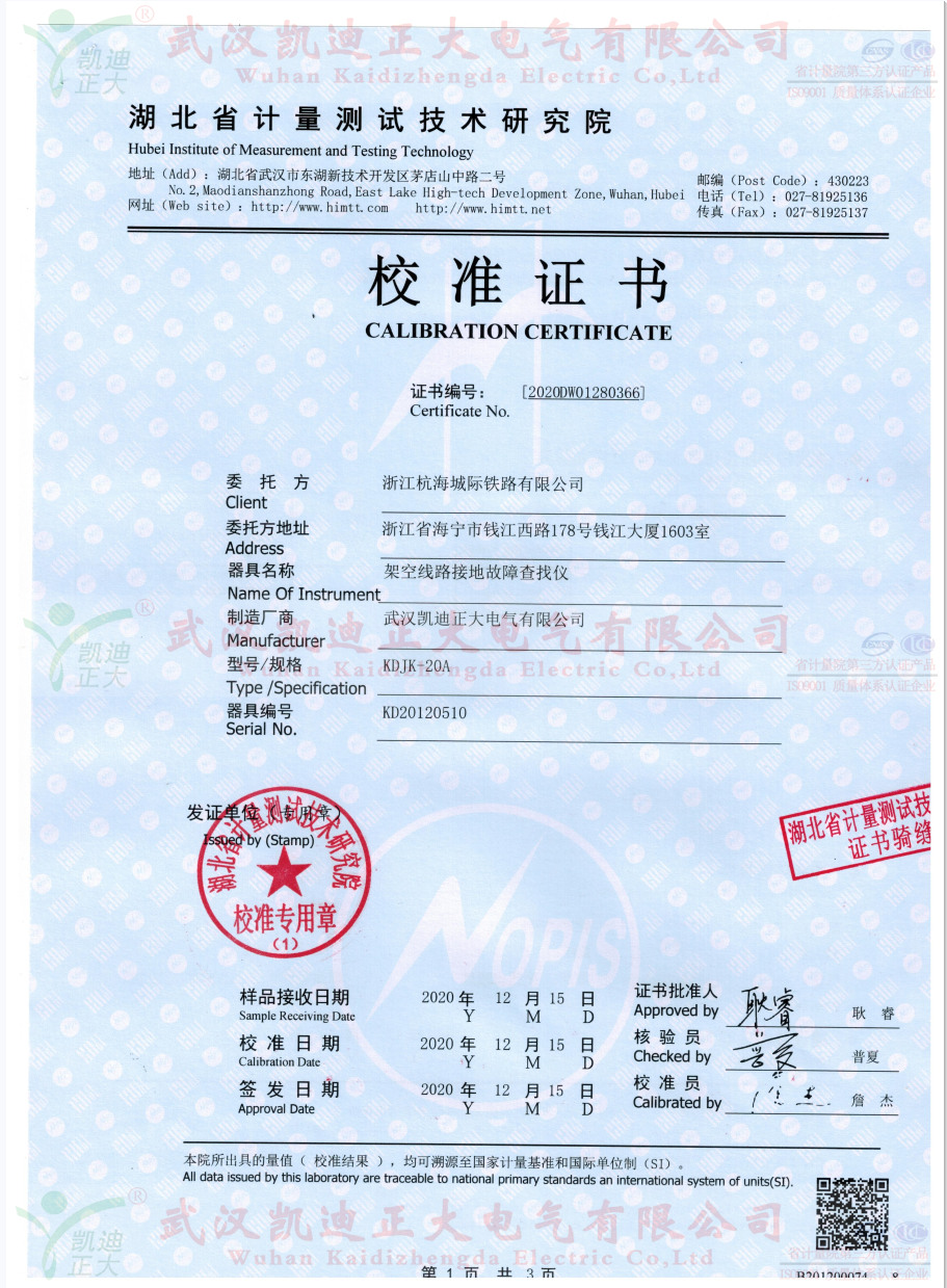 KDJK-20A架空線路接地故障查找儀獲得湖北計(jì)量院校準(zhǔn)證書(shū)