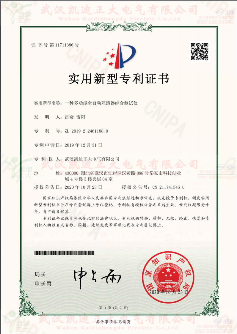 好消息!近日,凱迪正大再次獲得了5項實用新型專利證書!實用新型名稱是一種新型高壓開關特性測試儀、一種便于移動的電纜故障高壓測試儀、一種智能型絕緣電阻測試儀、一種工頻交流耐壓試驗裝置、和一種多功能自動互感器綜合測試儀專利證書。公司高級工程師與軟件工程師的智慧交融為企業榮譽再添輝煌。