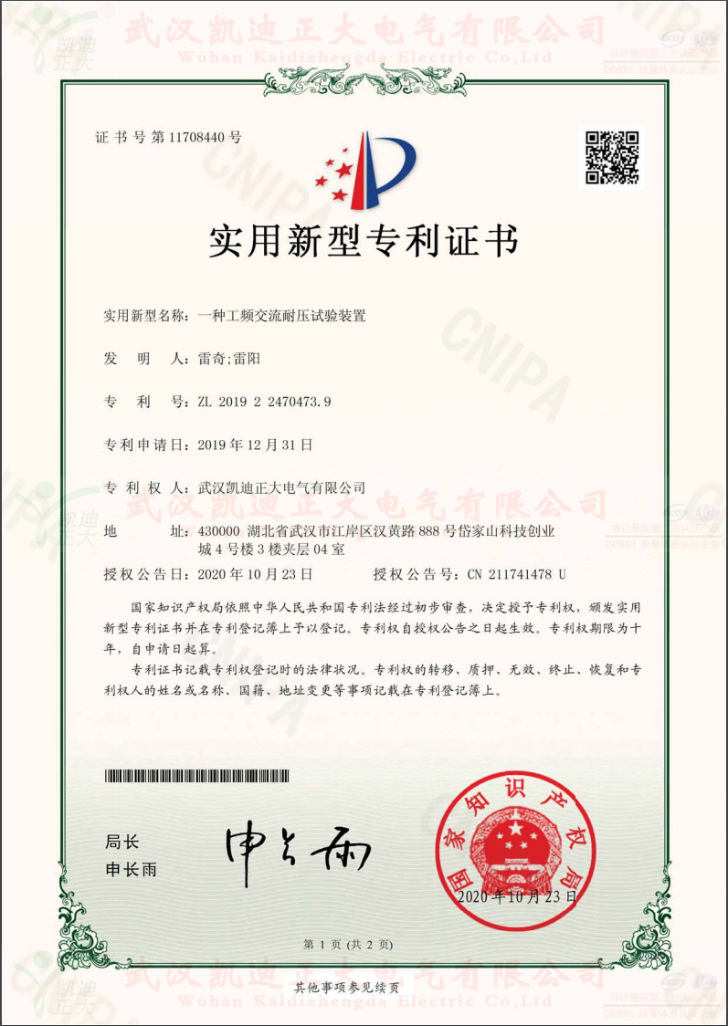 3、一種工頻交流耐壓試驗裝置。證書號第11708440號,專利號:ZL 2019 2 2470473.9,發明人:雷奇;雷陽,專利權人:武漢凱迪正大電氣有限公司,授權公告號:CN 211741478 U。