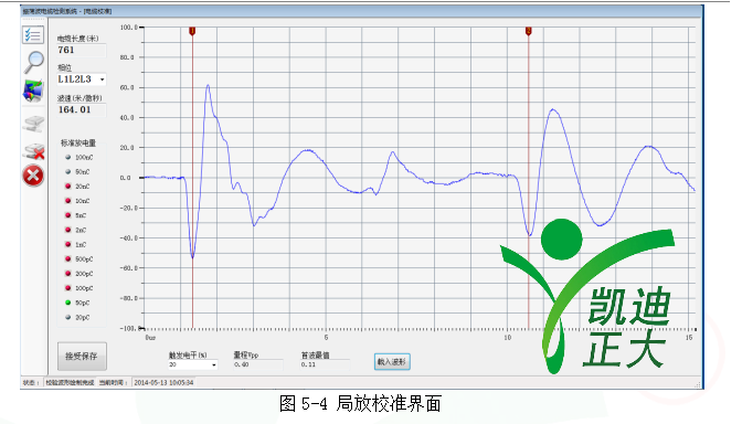 在測試軟件界面中點擊“局放校準”圖標,進入局放校準界面如圖5-4所示,局放校準界面提供20pC~100nC共12檔量程的局放校準,對被測電纜進行校準時,應和標準放電脈沖校準器的量程一一對應?,F場振蕩波試驗時,須對電纜進行校準。