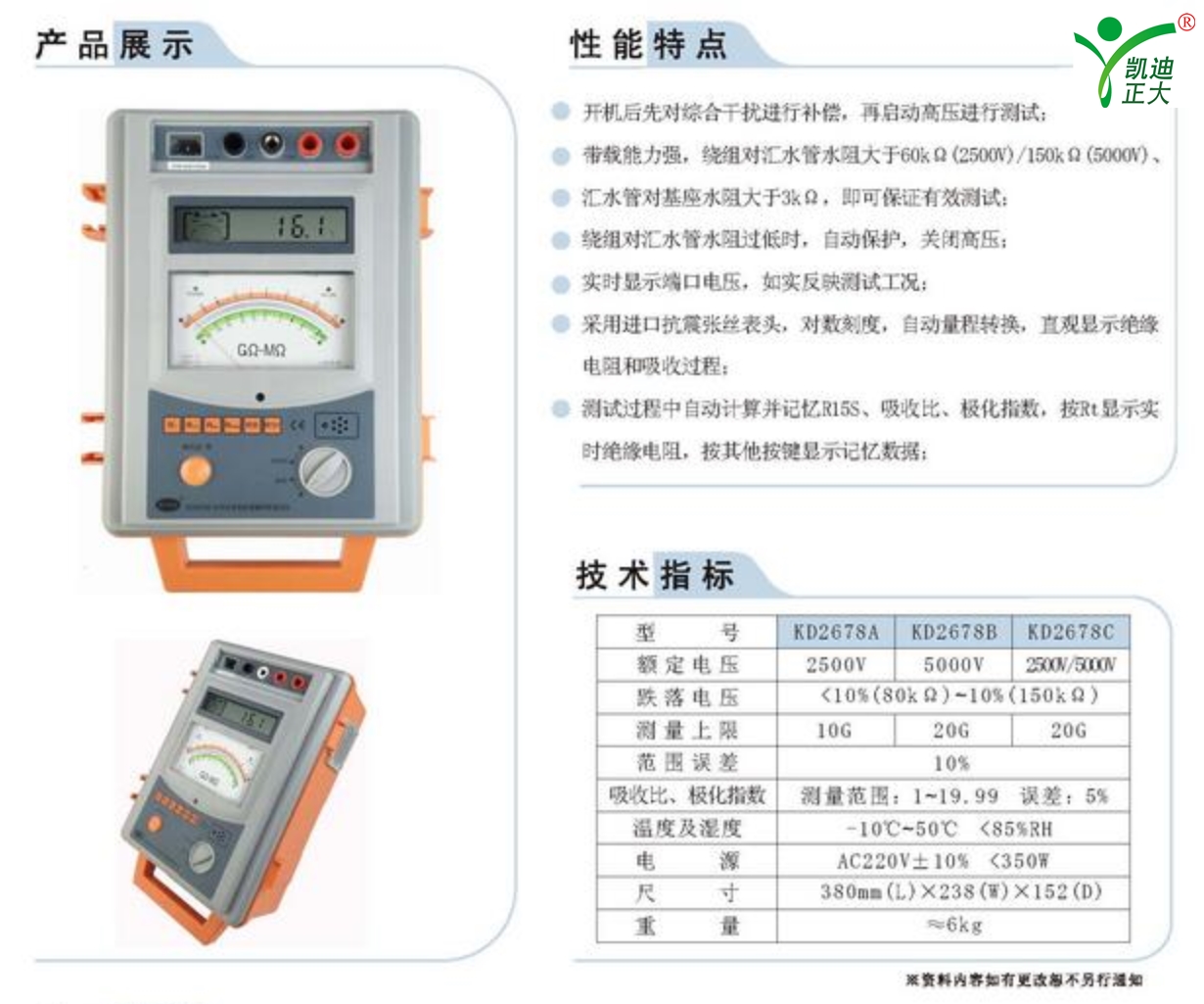 KD2678A水內(nèi)冷發(fā)電機絕緣測試儀專用于水內(nèi)冷發(fā)電機的測量試驗,同時也可用于試驗室或現(xiàn)場做絕緣測試試驗,該儀器測量原理新穎,操作簡便,精度高,整機采用全集成電路,抗震能力強,工作穩(wěn)定性好,輸出短路電流大,在現(xiàn)場環(huán)境下抗干擾能力強。執(zhí)行標(biāo)準(zhǔn):DL/T474.1-2006