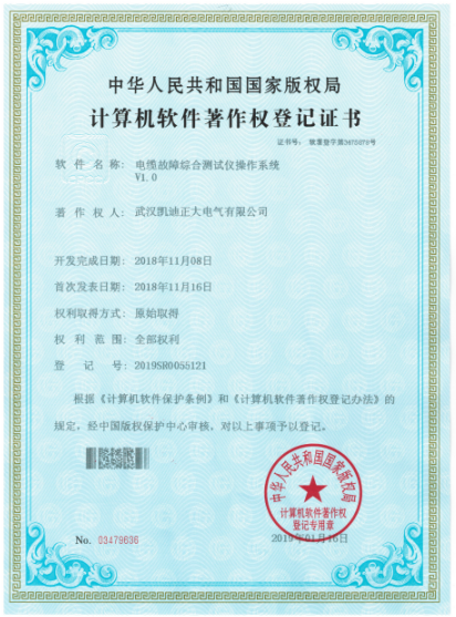 2019年,武漢凱迪正大電氣有限公司新力之作,榮獲中華人民共和國國家版權局《計算機軟件著作權登記證書》系統計算機軟件著作登記以及質量管理體系認證證書,其中包含電纜故障綜合測試儀操作系統V1.0(證書號:軟著登字第3475878號)、氧化鋅避雷器帶電測試儀操作系統V1.0(證書號:軟著登字第3478045號)、高壓開關動作特性測試儀操作系統V1.0(證書號:軟著登字第3478053號)、變頻串聯諧振耐壓試驗裝置操作系統V1.0(證書號:軟著登字第3475581號)、電纜震蕩波局放定位系統操作系統V1.0(證書號:軟著登字第3475874號)等證書共計5份。權利取得方式:原始取得。權利范圍:全部范圍。