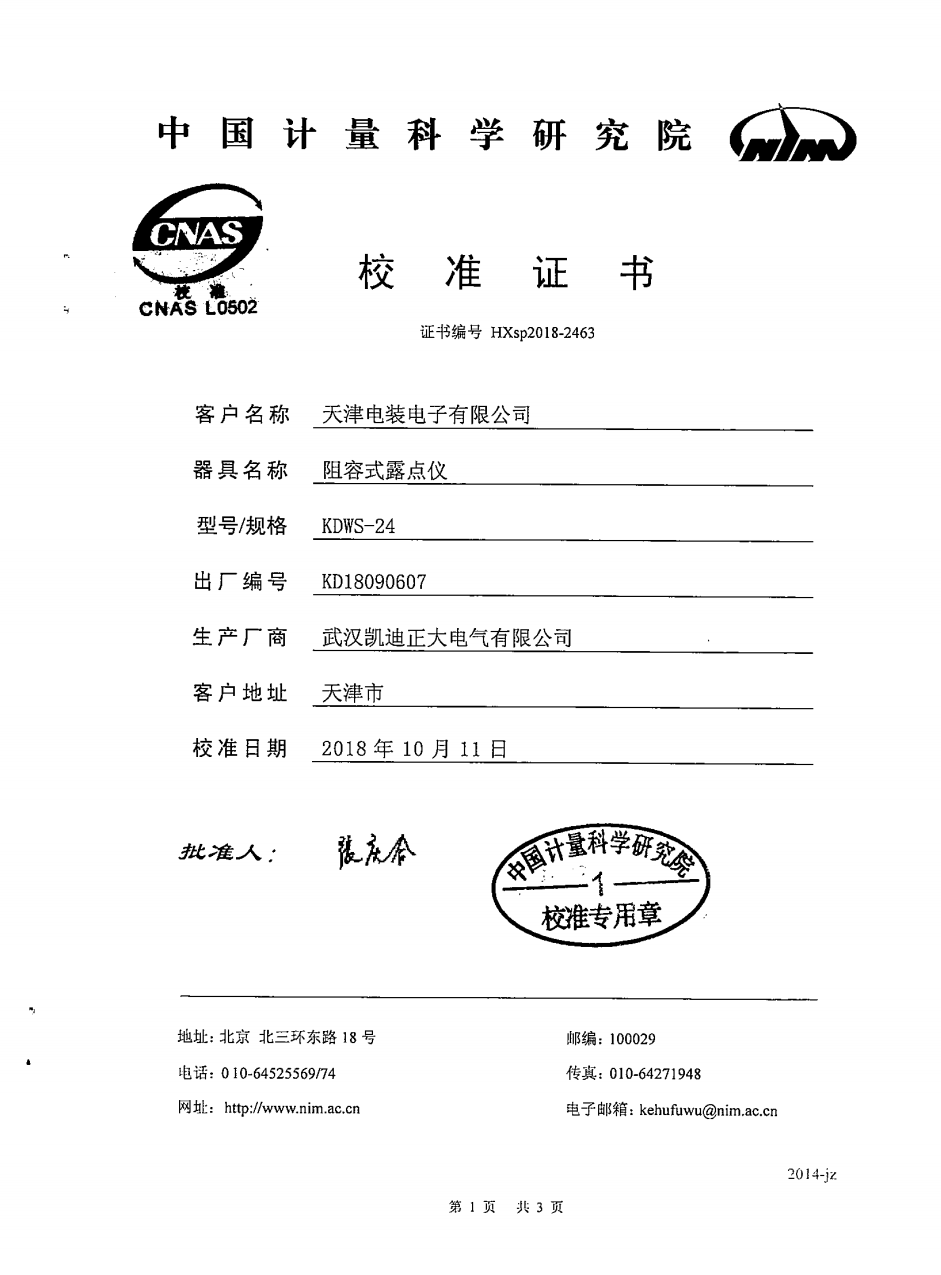 2018年10月,由天津電裝電子公司采購凱迪正大牌KDWS-24高精度露點儀,產品編號KD18090607,生產廠商:武漢凱迪正大電氣有限公司。校準日期:2018年10月11日。