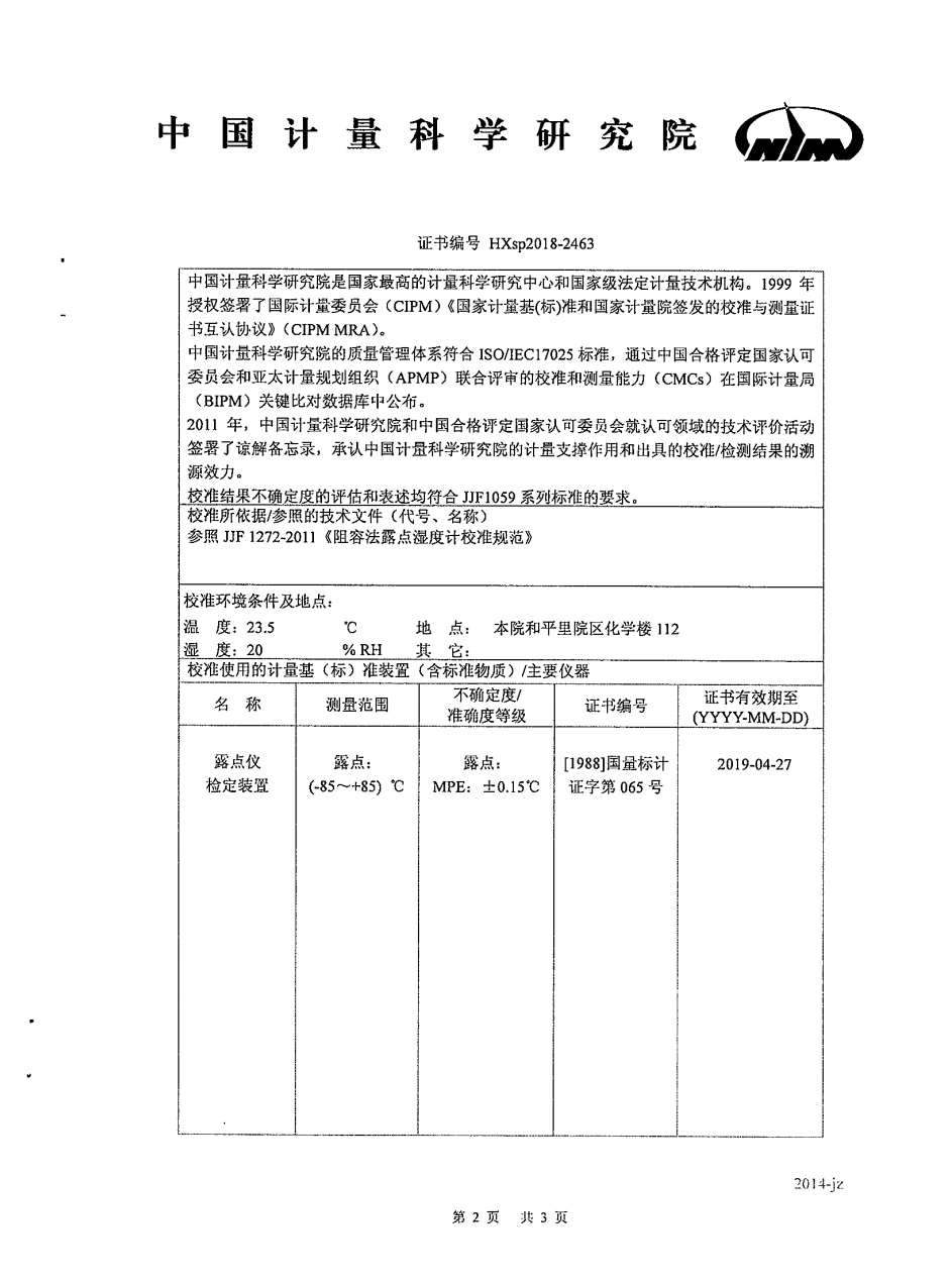 我司高精度露點儀獲得中國計量科學研究院檢測合格