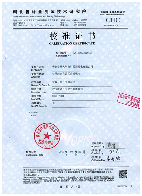 武漢凱迪正大KDKC2008有載分接開關測試儀校準證書