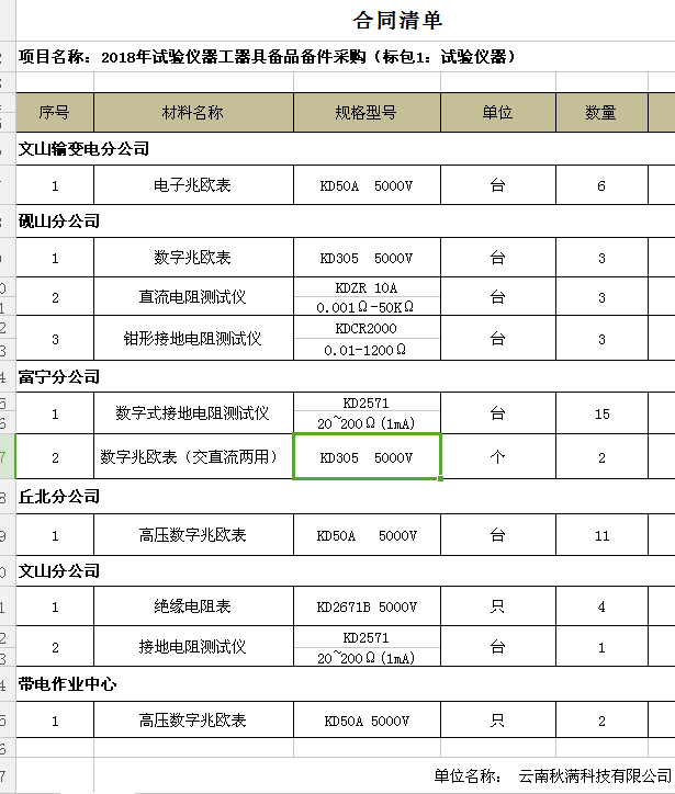 隨即,云南文山電力股份有限公司在我司生產(chǎn)的KD50A電子兆歐表,KD305數(shù)字兆歐表,KDZR-10A直流電阻測試儀,KDCR2000鉗形接地電阻測試儀,KD2671絕緣搖表,KD2571接地電阻測試儀等設備參數(shù)中看中優(yōu)于同行業(yè)電氣廠家的性能,價格優(yōu)勢、售后服務、良好的市場口碑判定中標人云南秋滿公司。