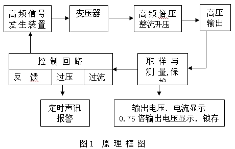 凱迪正大系列直流高壓發生器應用最新電力電子技術,采用高新的PWM調制技術及大功率MOSFET器件,通過中頻倍壓整流而成;該發生器具有紋波系數小、輸出穩定可靠,體積小、重量輕的特點,且具有可靠、靈敏的內部保護功能,其原理框圖如圖所示。
