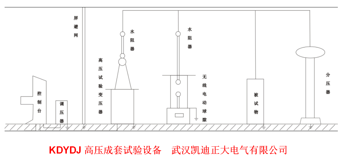成套試驗設備(包括YDJ高壓試驗變壓器、KDYD控制臺、調壓器、以及球隙器、水電阻、分壓器和被試物)裝配聯結示意圖。