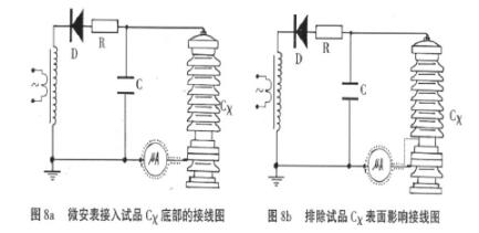 c.對氧化鋅、磁吹避雷器等試品接地端可拆開的情況下,也可采用在試品的底部(地電位側)串入電流表進行測量的方式。 當要排除試品表面泄漏電流的影響,可用軟的裸銅線在試品地電位端繞上幾圈并與屏蔽線的屏蔽相聯接(見下圖)
