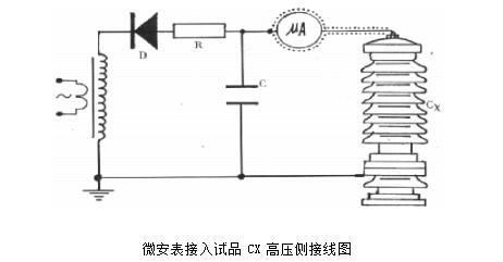 a.一般測量時,當便攜式直流高壓發生器接好線后,先把聯接試品的線懸空,升到試驗電壓后讀取空試時的電暈和雜散電流I,然后接上試品升到試驗電壓讀取總電流Ⅰ1;試品泄漏電流:Io =Ⅰ1—I’ b.當需要精確測量被試品泄漏電流時,則應在高壓側串入高壓微安表(見下圖)