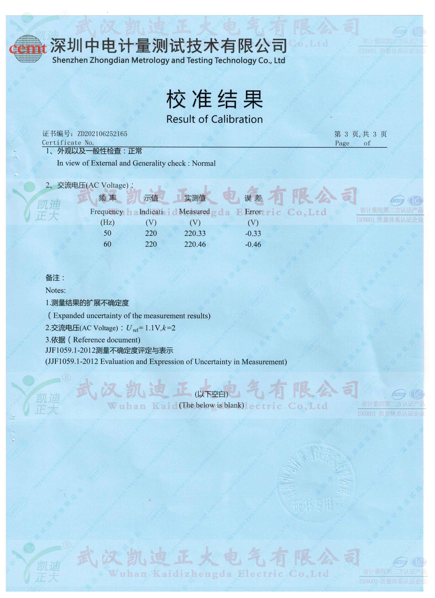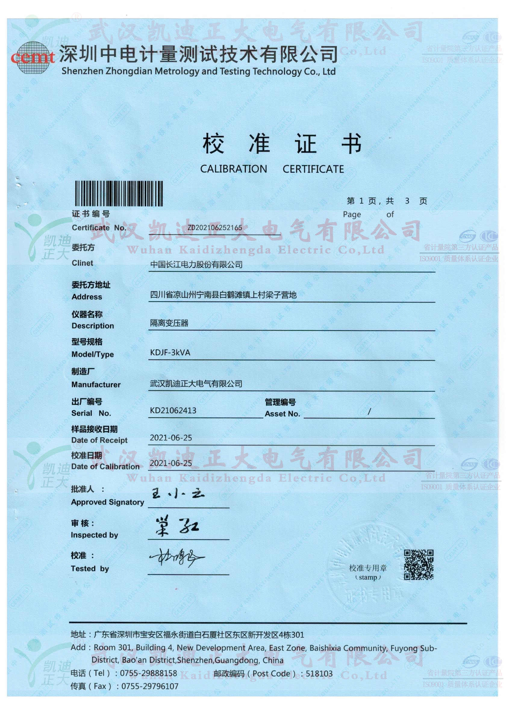 長江電力這次購買的隔離變壓器KD-JF3KVA獲得了中電計量的校準證書,證書號:ZD202106252165委托方:中國長江電力股份有限公司,地址:四川省涼山州寧南縣白鶴灘鎮(zhèn)上村梁子營地。隔離變壓器主要用于互感器、電力變壓器、高壓斷路器、耦合電容器、電容套管、開關(guān)等試品進行工頻耐壓、局部放電及其他科學(xué)試驗研究。KDQJF-30kVA/100kV無局放SF6工頻耐壓試驗裝置采用充氣式無局放試驗變壓器做為高壓電源,經(jīng)過KD-JF3KVA隔離濾波裝置,取得50Hz正弦波為純凈局放量≤2PC的高壓電源,波形失真≤5%然后經(jīng)無局放耦合電容器取得高壓電路中的脈沖信號經(jīng)局放儀檢測被試品的局放量。本套設(shè)備參照GB/T16927.1高電壓試驗技術(shù)第一部分一般試驗要求;DL/T 848.3高壓試驗裝置通用技術(shù)條件 第3部分:無局放試驗變壓器等相關(guān)標準。