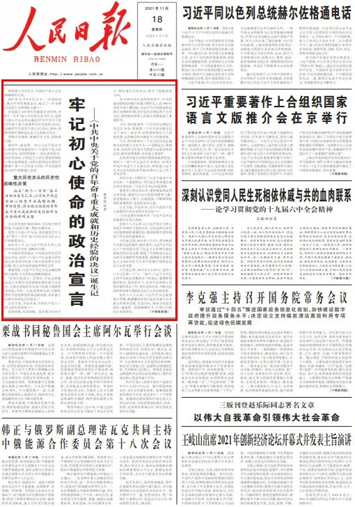 11月16日,隨著新華社發(fā)向全球的電波,《中共中央關(guān)于黨的百年奮斗重大成就和歷史經(jīng)驗(yàn)的決議》對外公布。