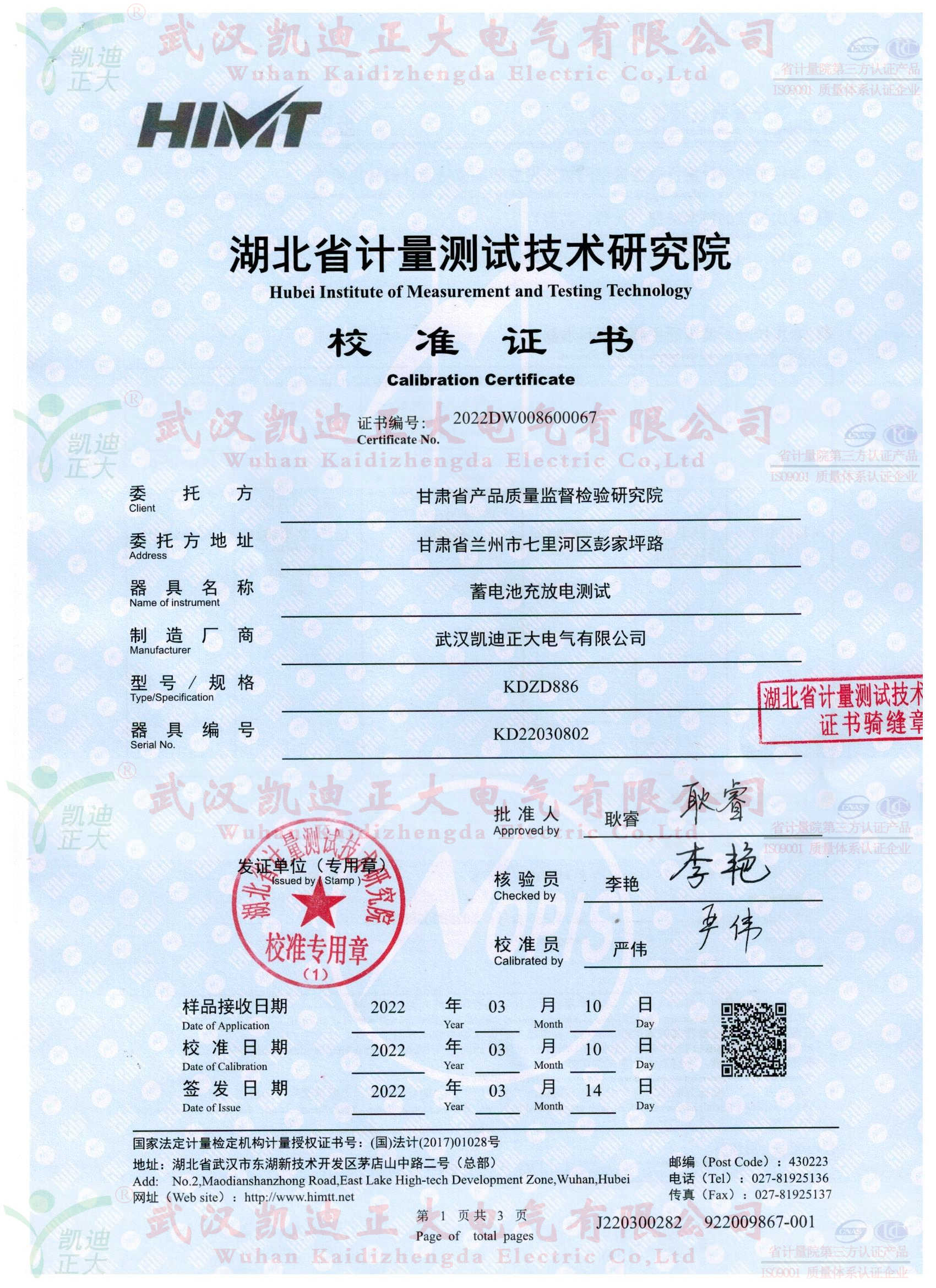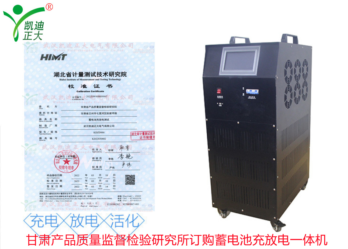 甘肅省產(chǎn)品質(zhì)量監(jiān)督檢驗(yàn)研究院在了解我司KDZD886蓄電池充放電測試儀集蓄電池恒流放電,智能充電,活化于一體等功能。隨即采購KDZD886蓄電池充放電測試儀,要求獲得湖北省計(jì)量測試技術(shù)研究院的檢定合格報告。