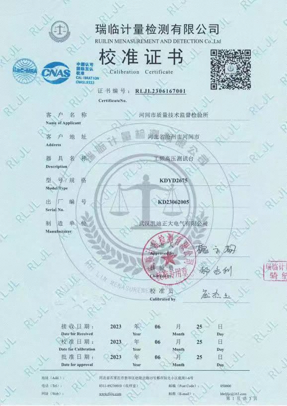 河間市質量技術監督檢驗所采購我司KDYD2675 工頻高壓測試臺,應技術要求送第三方檢測機構瑞臨計量檢測有限公司檢定。